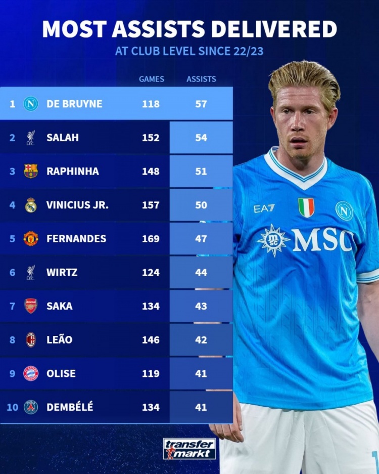 9月19日讯 昨晚,在一场备受瞩目的欧冠比赛中,那不勒斯在客场以0-2不敌曼城。值得一提的是,德布劳内面对旧东家时,由于战术调整被提前替换下场。然而,根据《转会市场》的数据显示,他依然在过去三年中,成为俱乐部层面助攻最多的球员。