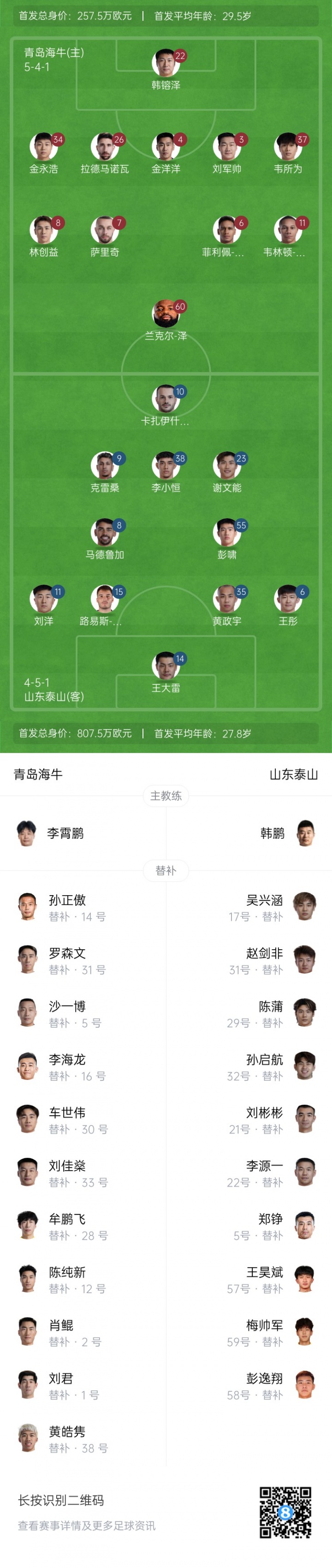 青岛海牛的替补阵容同样不容小觑,刘君、牟鹏飞等人都在默默积蓄力量,等待着出战的机会。而山东泰山的替补则涵盖了多位经验丰富的球员,孙启航、郑铮等人才都渴望一展身手,为球队注入新的活力。