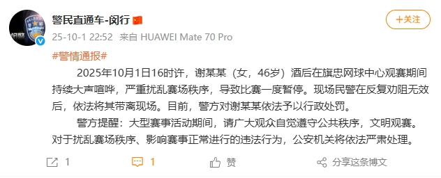 上海市公安局闵行分局随后对此事件进行了通报,指出涉事女子名叫谢某某,46岁,事发时醉酒观赛。她在观赛期间的喧闹行为不仅搅扰了赛事的正常进行,还导致比赛一度暂停。经过现场民警的耐心劝导并未见成效后,警方依法将她带离现场。对此,警方对谢某某实施了行政处罚。