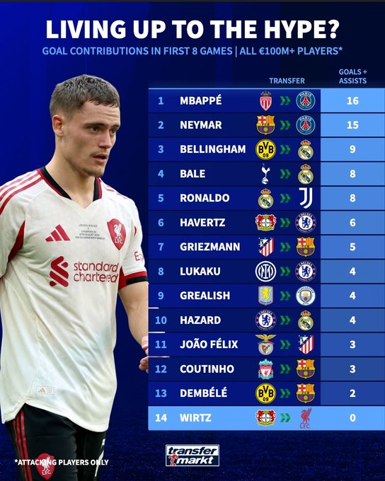 近日,德国转会市场以一种“恶趣味”的方式,梳理了那些身价超亿欧元的前锋们在新球队前八场比赛中的进球与助攻的表现。在这张榜单上,姆巴佩、内马尔和贝林厄姆不出意外地占据了前列的位置,然而在这份名单的末尾,维尔茨却如同一盘饺子的调味料,几乎为人所忽视。