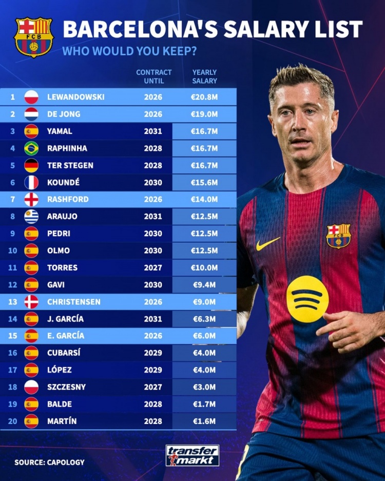 德轉公布巴薩薪資排行 萊萬以2080萬歐元位居第一 德容以1900萬歐元緊隨其後