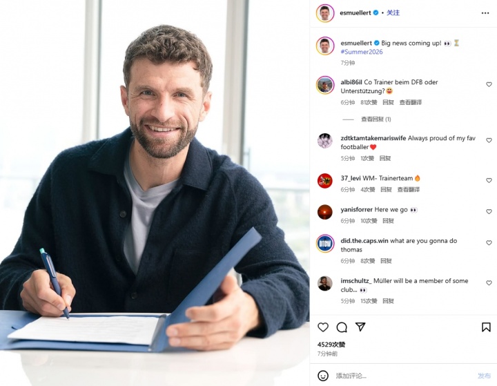 10月10日讯,穆勒近日在社交媒体上发出一条引人注目的动态,暗示即将发布重磅消息并配上#2026夏天#的标签。这一消息引发了球迷们的热烈讨论,有人纷纷猜测穆勒可能以教练组成员的身份参与2026年世界杯。