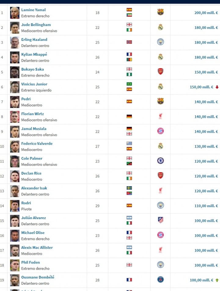 在西甲,巴萨的亚马尔以2亿的身价遥遥领先,佩德里则以1.4亿价值崭露头角。皇马的明星阵容中,贝林厄姆和姆巴佩的出现则为球队增光添彩,各自的身价均为1.8亿,而维尼修斯和巴尔韦德的身价也不容小觑,分别为1.5亿和1.3亿,马竞的阿尔瓦雷斯则以1亿的身价补充了西甲的亿元先生数据显示。