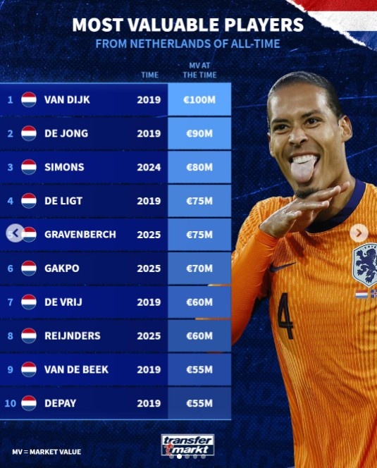 荷蘭球員歷史身價排名:範迪克以1億歐元居首,弗蘭基-德容以9000萬歐元緊隨其後